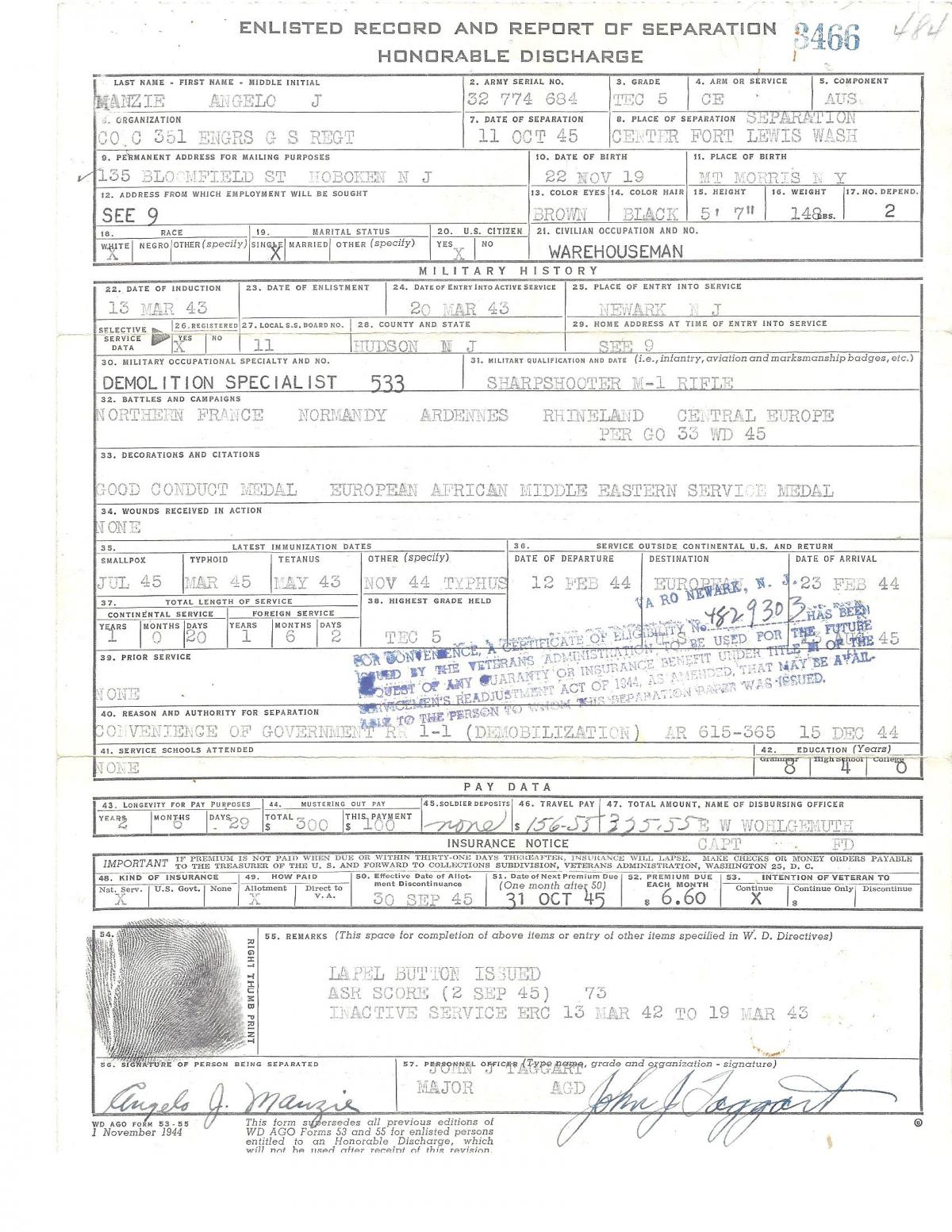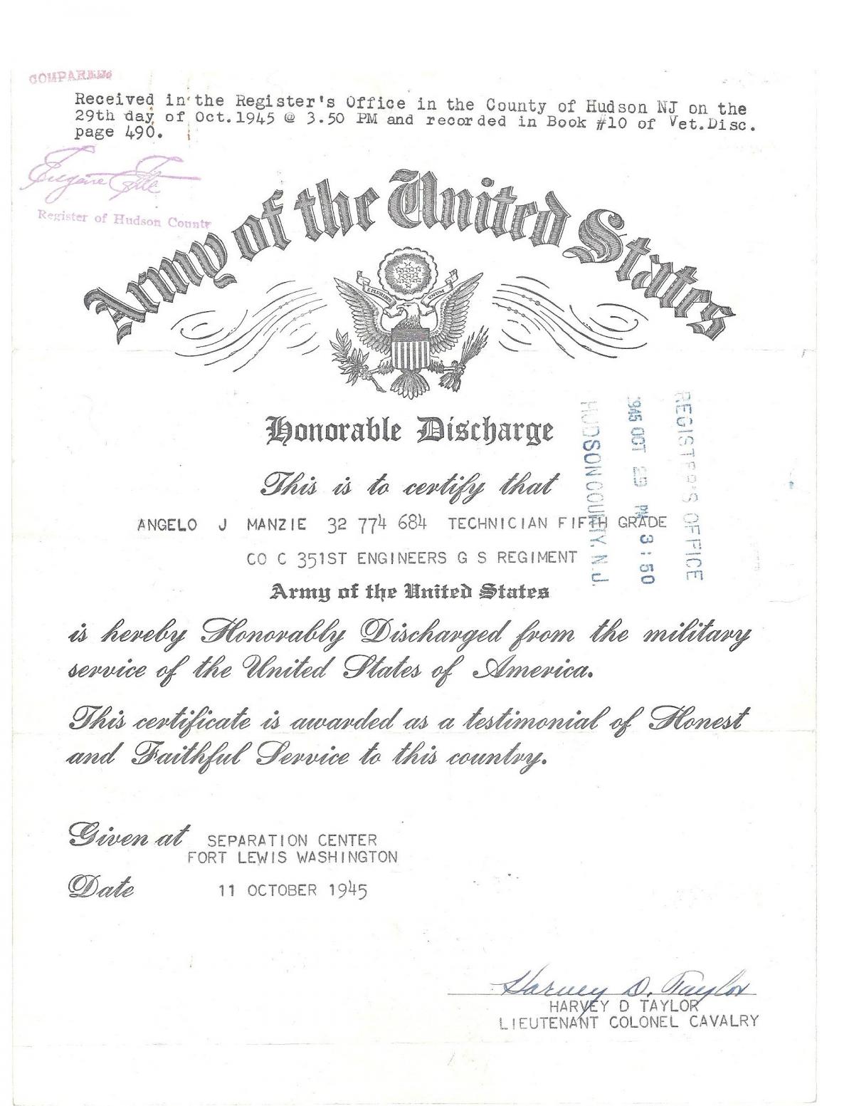 351st General Service Regiment - Walt's Daughter - 07-31-2012 That simply indicated a beachhead landing... 351st General Service Regiment - pmanzie - 04-07-2015 New to this wonderful site! My father recently passed at 90 but before he died he asked that I "learn" about his engineer unit and try to find family members of his two best buddies. It was odd because all my life (and I am 60) he refused to discuss anything about his army days. Near death, he said he was in the 293rd Engineer Battalion General Services and he told me where to find some pictures of him and his buddies during the war and training. He had never let on that he had these pictures. Problem is that with his picures were also many of his separation papers. These papers clearly show that he was in Co C. 351st Engineer bn GS. But the pictures he directed me to clearly show 293rd Engineer bn trucks and named barracks type buildings in the background (specifically 2nd Plt, Co B. 293rd). His name is Angelo Manzie and his buddies were George McNeill and George Claussen, In his memory I want to learn all I can about his unit... 351st General Service Regiment - pmanzie - 04-07-2015 I found some photos I had not known existed. I will post them in the 293rd forum. I hope they mean somethng to someone. 351st General Service Regiment - Walt's Daughter - 04-07-2015 Hmm, will have to ascertain, but it is not unlikely that he could have been in both. Let me look into this. Oh, BTW, welcome to the forum! 351st General Service Regiment - Walt's Daughter - 04-07-2015 Is it possible you can send me or upload a copy of this separation papers? 351st General Service Regiment - pmanzie - 04-07-2015 I can scan and send you the papers. Do I do it on here, or another email address? 351st General Service Regiment - Walt's Daughter - 04-07-2015 You can send it to my email address, or if you'd like, simply upload it here. That is up to you. 351st General Service Regiment - pmanzie - 04-07-2015 Here you go. Front and back in 2 pages. 351st General Service Regiment - Walt's Daughter - 04-07-2015 It is also a good possibility, this was the unit he shipped home with. This wasn't unusual, especially if he stayed in occupied Europe for a while.