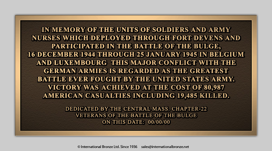 Ft. Devens at Ayer, ( Shirley) MA was one of the Army Posts shut down by the US Government. It will soon become a small township with a name of it's own. There is a small remnant of Army buildings there,but mostly taken over by civilian corporations etc. On the parade grounds there are a few monuments to Army units at the flagpole Center. A memorial wall contains four plaques stating the various Army Units, such as the 1st Inf. Div. and others which deployed through the old Fort since World War II. Our Central Mass. Chapter-22 VBOB will place a plaque with these others ; to honor soldiers and Nurses who deployed through this grand old Post into the "Battle of the Bulge"....The plaque is shown here.